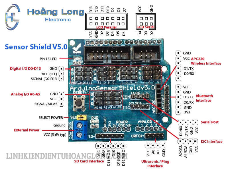 Arduino Uno R3 Shield V5 có thể sử dụng qua giao tiếp I2C vì vây chúng ta có thể kết nối các module cảm biến 1 cách dễ dàng.Mỗi module có 1 ngõ cấp nguồn riêng cho thiết bị ngoại vi khi kết nối với Shield, dễ dàng điều khiển các thiết bị như động cơ servo,cảm biến tiệm cận, siêu âm..