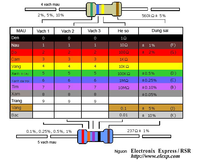 Mình ví dụ : 1Loại điện trở có 4 vong màu: đỏ nâu ngân vàng