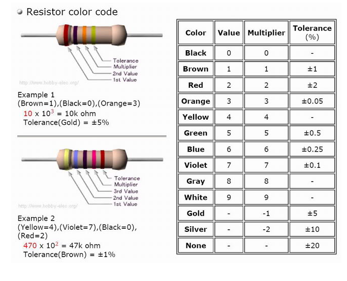- Điện trở có 4 vòng màu ( 2 vòng màu là 2 chữ số đầu của giá trị, vòng thứ 3 thể hiện số " 0 " đứng sau , vòng thứ tư thể hiện sai số.