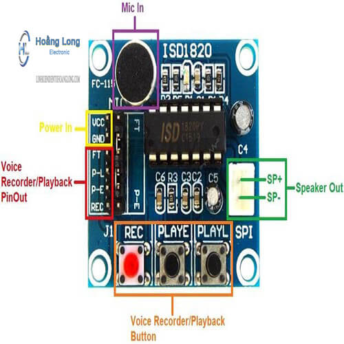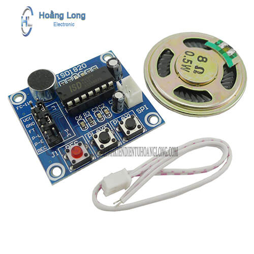 Mạch Thu Phát Âm Thanh ISD1820 - V2 được sử dụng để lưu và phát âm thanh do người dùng ghi vào. Mạch có tích hợp sẵn micro trên board nên có thể thu âm trực tiếp, dữ liệu được lưu trữ đến 100 năm và có thể ghi - xóa đến 100.000 lần. Mạch có thể ghi âm được khoảng 10 giây.