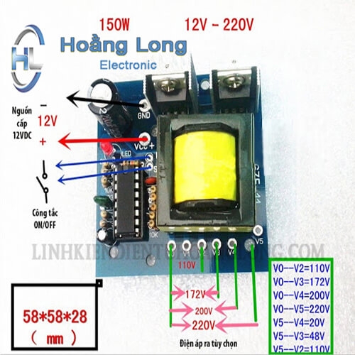 - Biến điện áp 12VDC sang nhiều mức điện áp AC khác nhau.