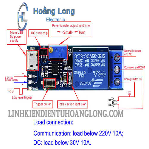 Mạch kích tạo trễ đóng ngắt relay 0 ~ 24 Giây có chức năng đóng relay sau khi kích hoạt nút nhấn, thời gian đóng relay có thể điều chỉnh từ 0 ~ 24 giây bằng chiết áp tích hợp trên mạch, sau khi kết thúc thời gian mạch ngắt relay trở về trạng thái ban đầu và chờ lệnh kích tiếp theo.