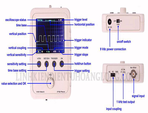 Máy hiện sóng Oscilloscope - DSO150 sử dụng bộ xử lý ARM Cortex-M3 và với màn hình TFT 2.4-inch. Máy có thể hiển thị dạng sóng thông số, chẳng hạn như tần số, thời gian, độ rộng xung, duty ratio, các giá trị Min/Max, đỉnh - đỉnh.
