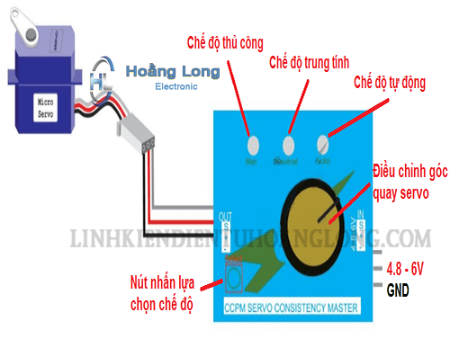 Mạch có sẵn 3 chương trình để test như: quay servo bằng biến trở, chế độ tự động chạy xoay vòng, chế độ giữ cứng động cơ.